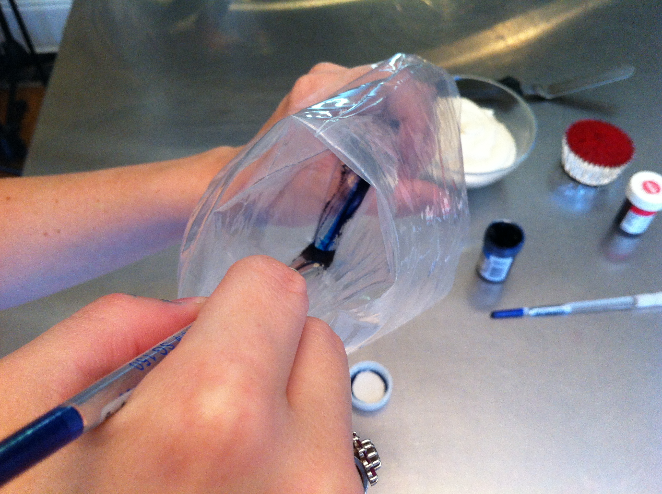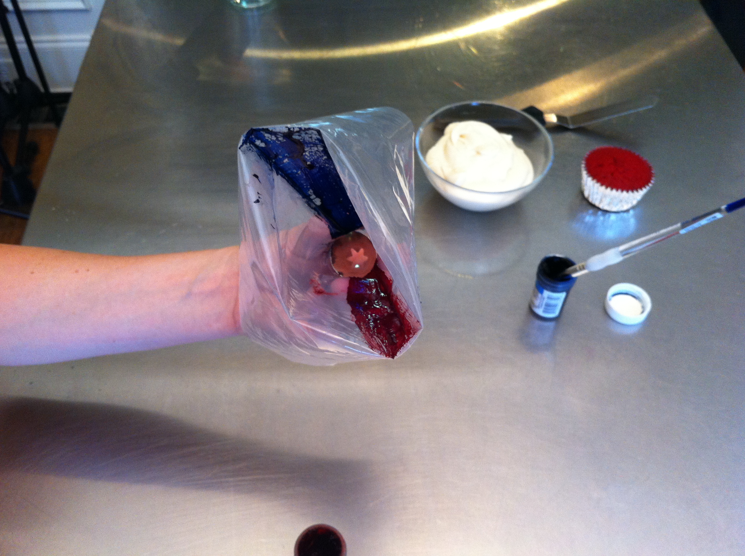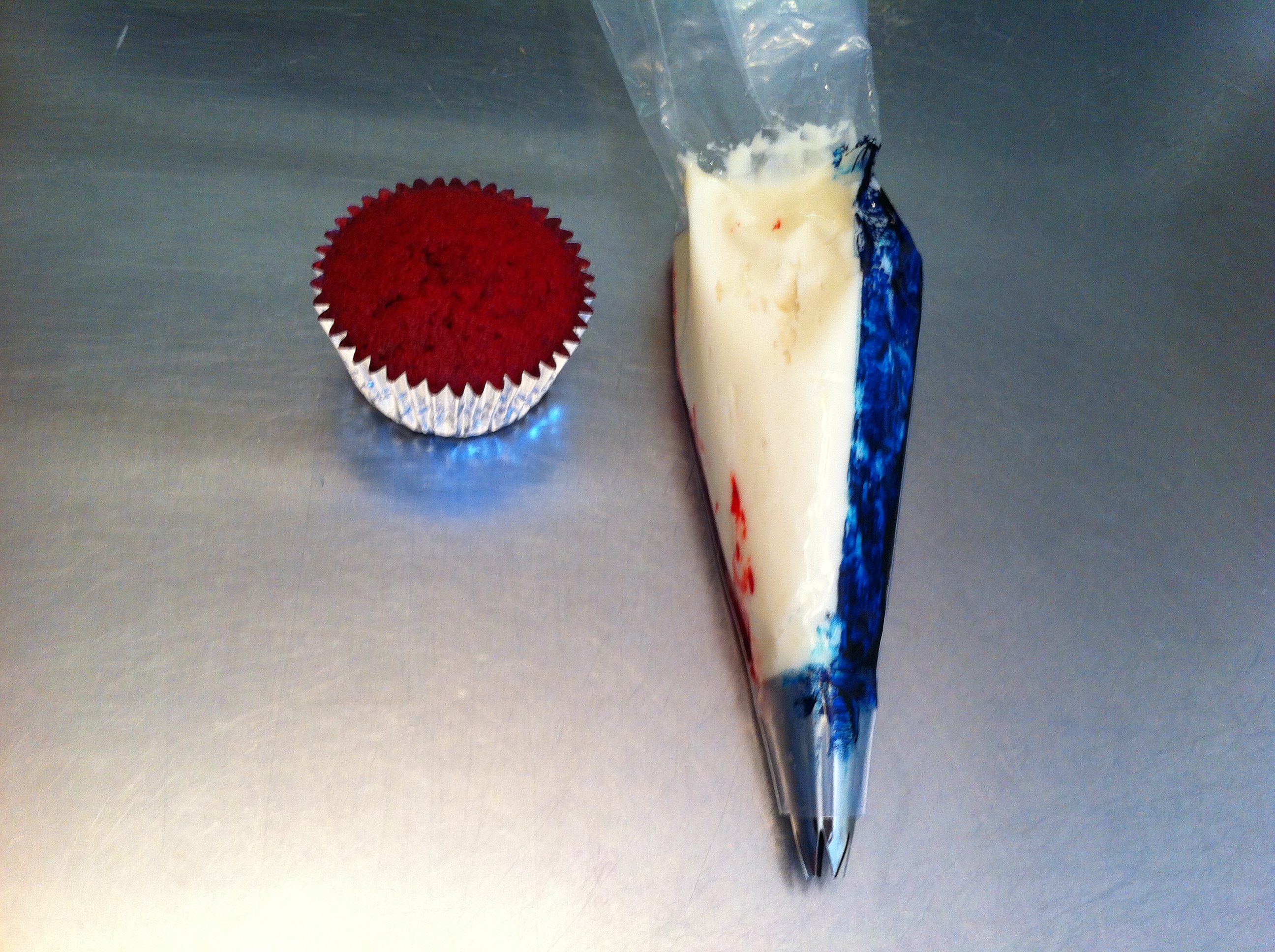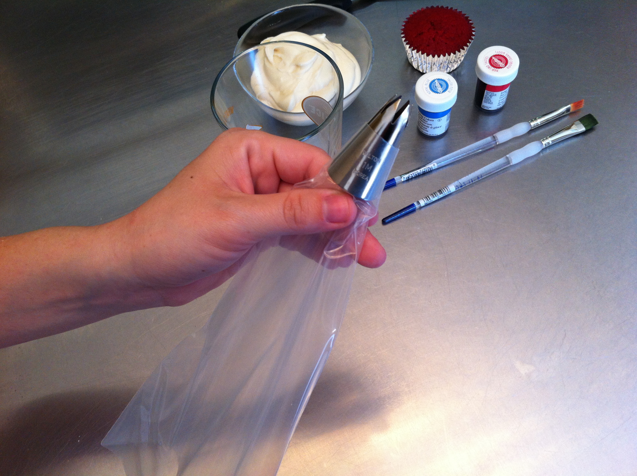 From left to right, I have scissors, a pastry bag, tip 1M, two paint brushes (used only for cakes), a drinking glass, red and blue icing color paste, icing, a cupcake, and an angled spatula. If you don’t have any paint brushes dedicated to food projects, you could use a butter knife and get the same result. I think you’ll be amazed at how easy this is, so here we go.