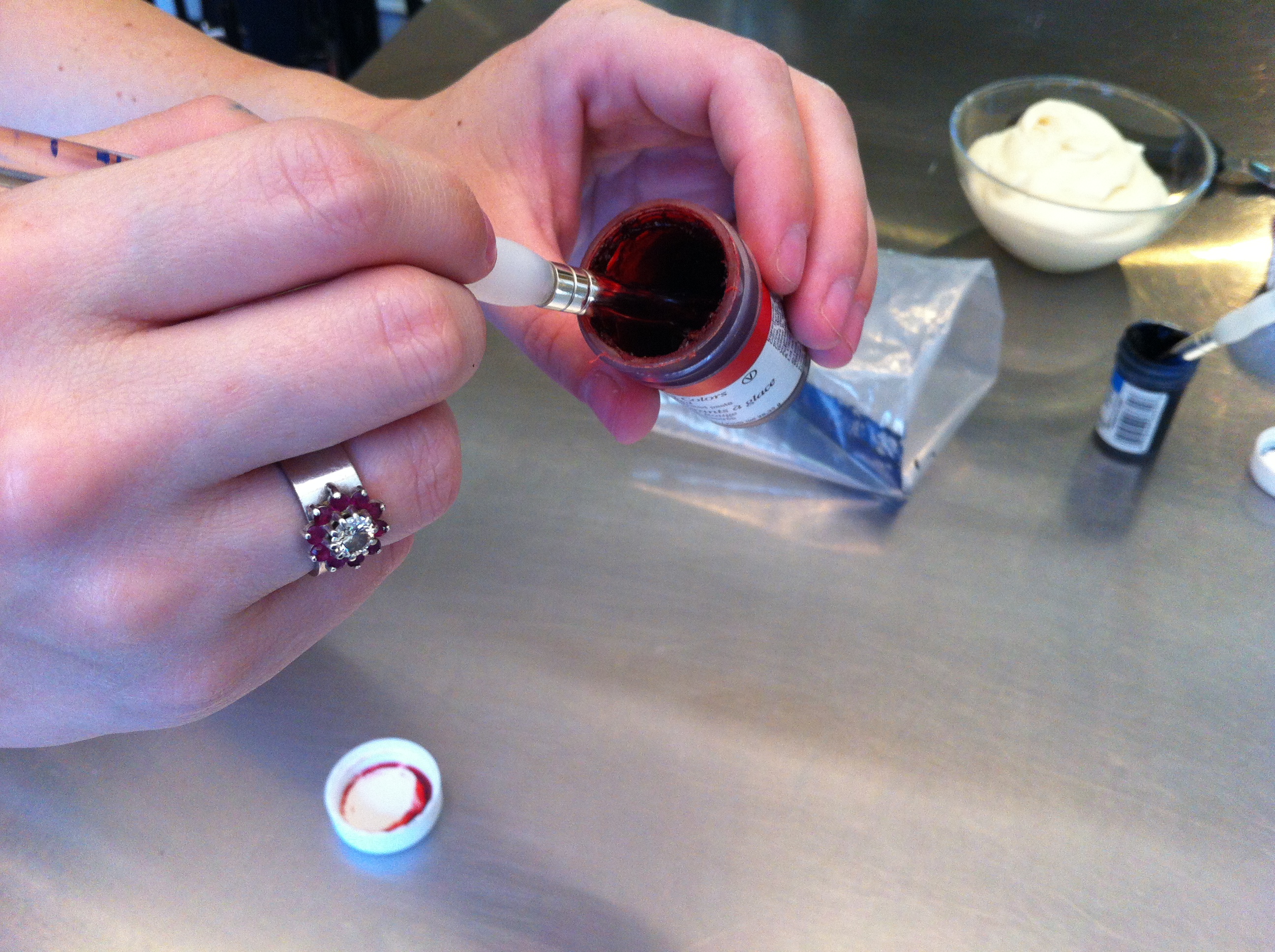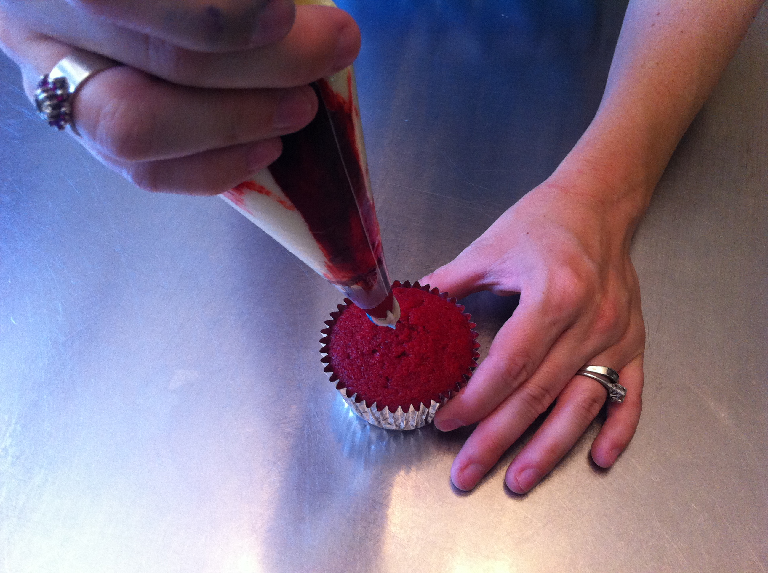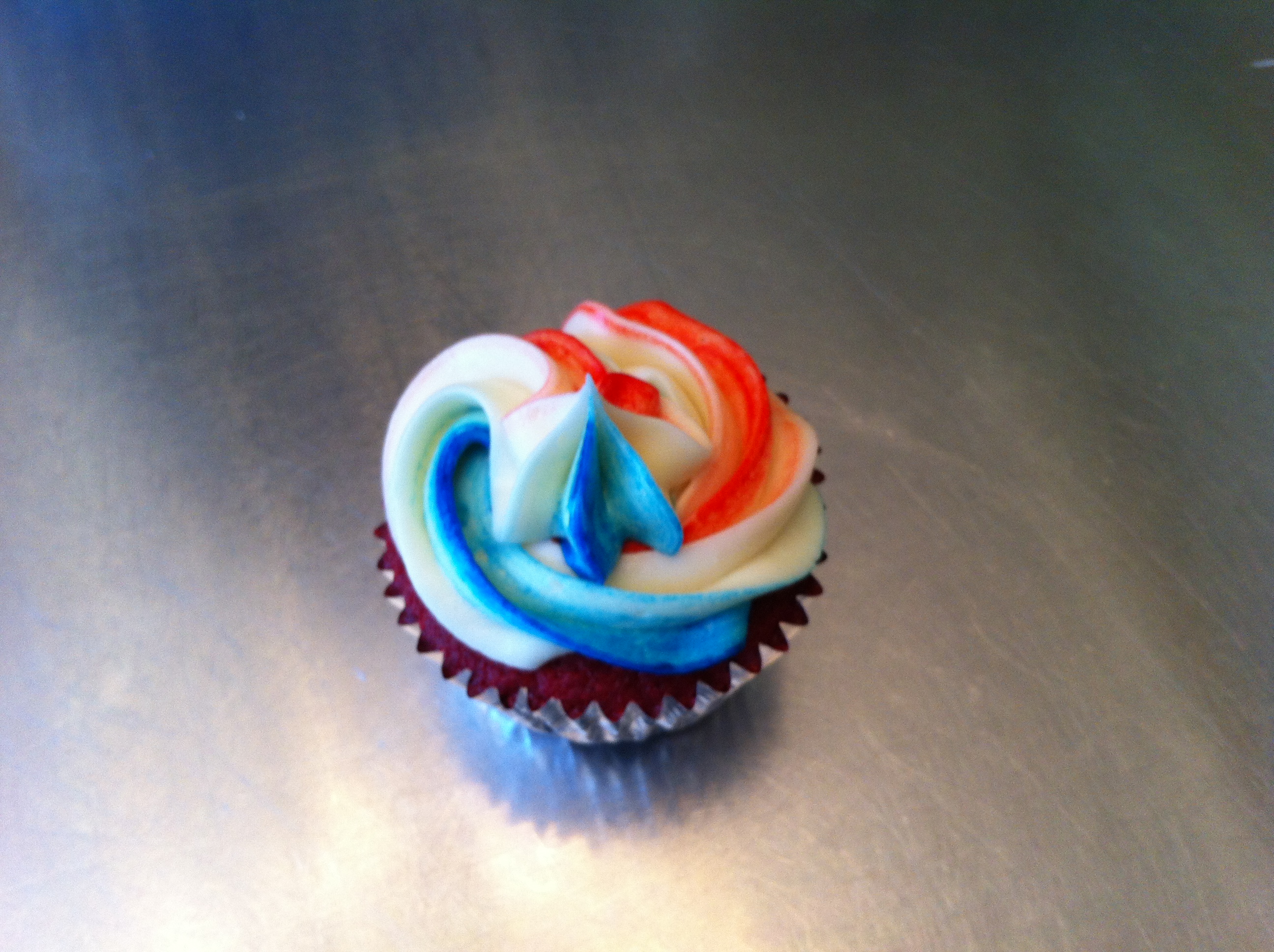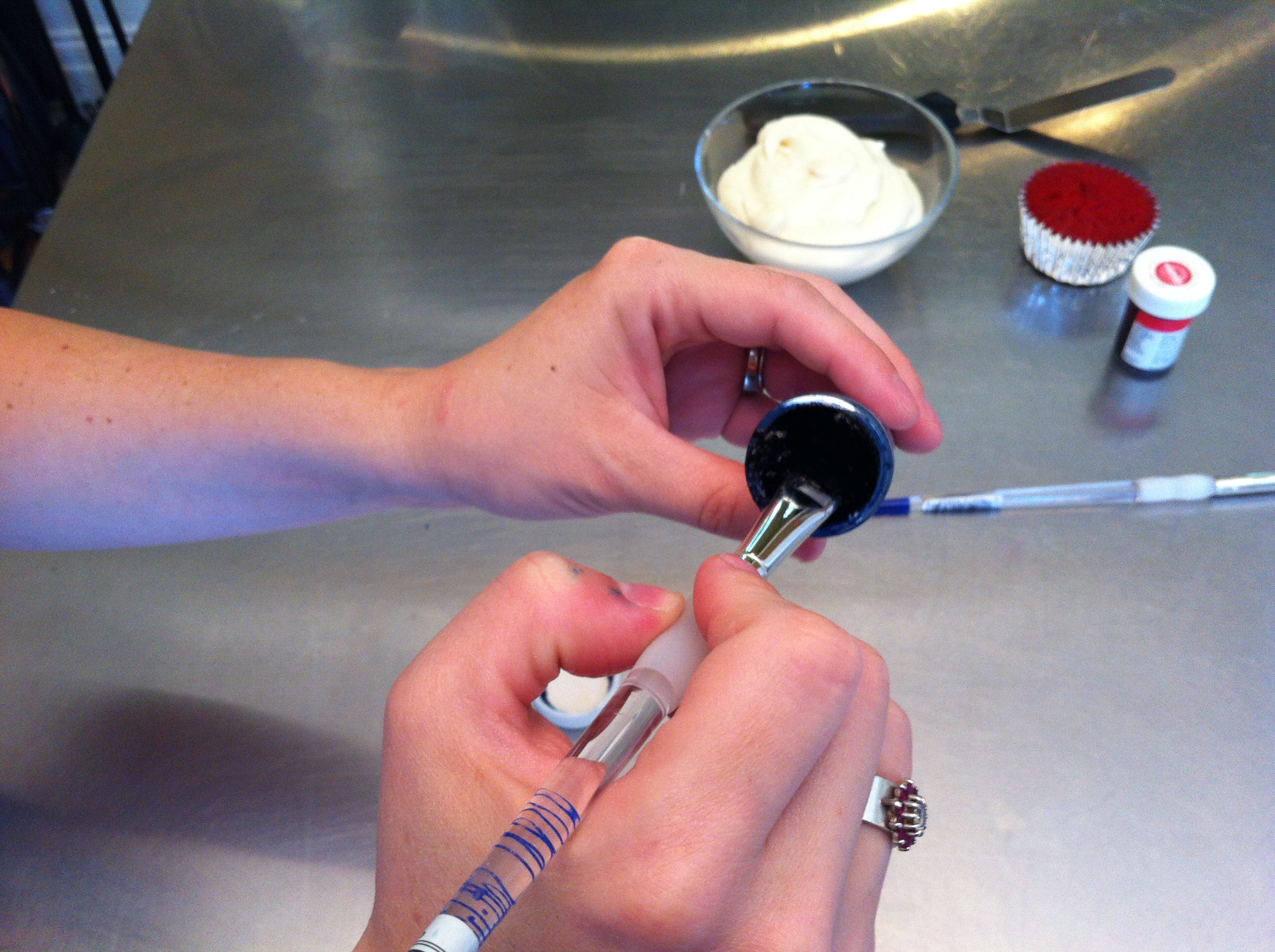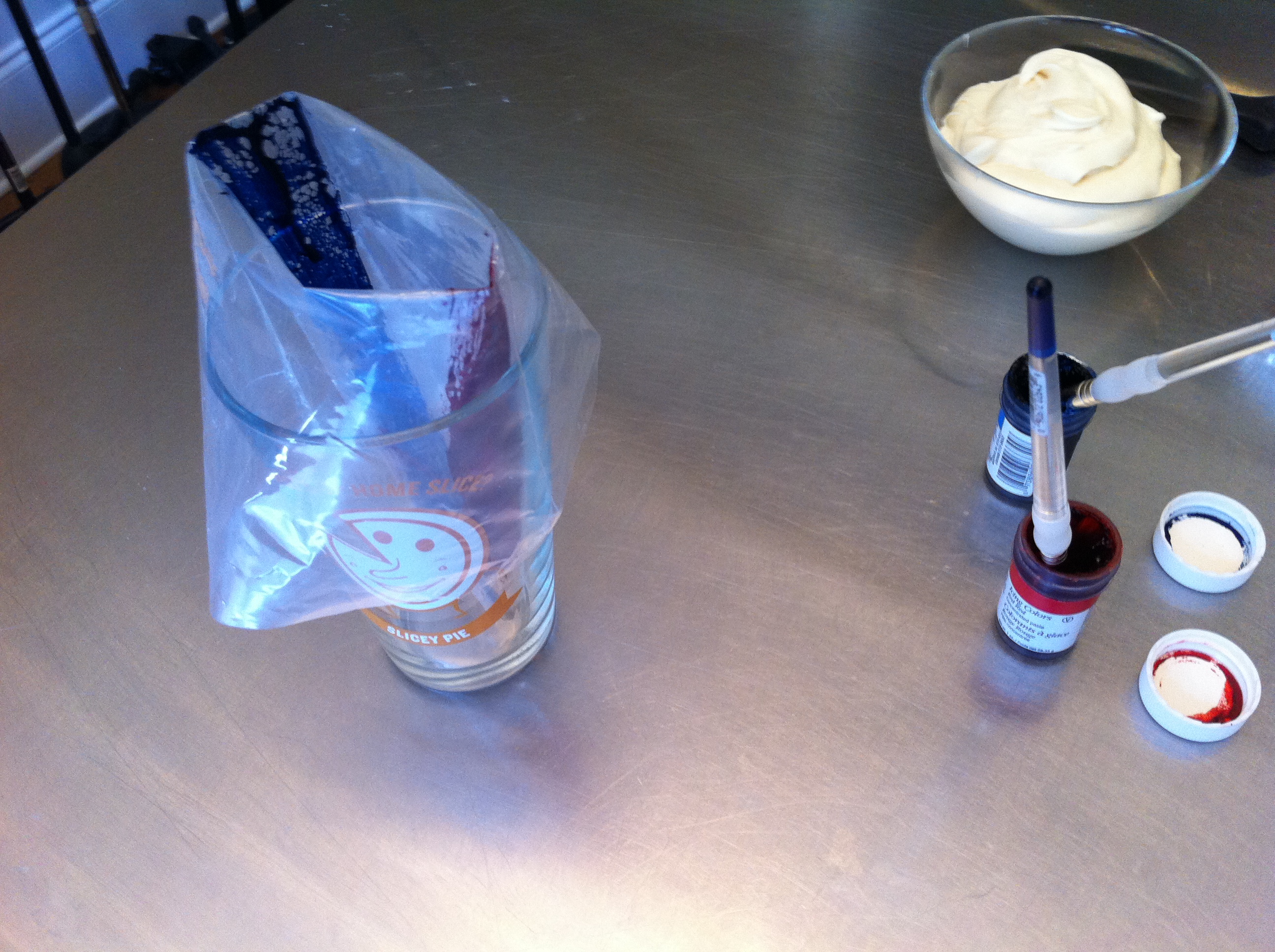 From left to right, I have scissors, a pastry bag, tip 1M, two paint brushes (used only for cakes), a drinking glass, red and blue icing color paste, icing, a cupcake, and an angled spatula. If you don’t have any paint brushes dedicated to food projects, you could use a butter knife and get the same result. I think you’ll be amazed at how easy this is, so here we go.