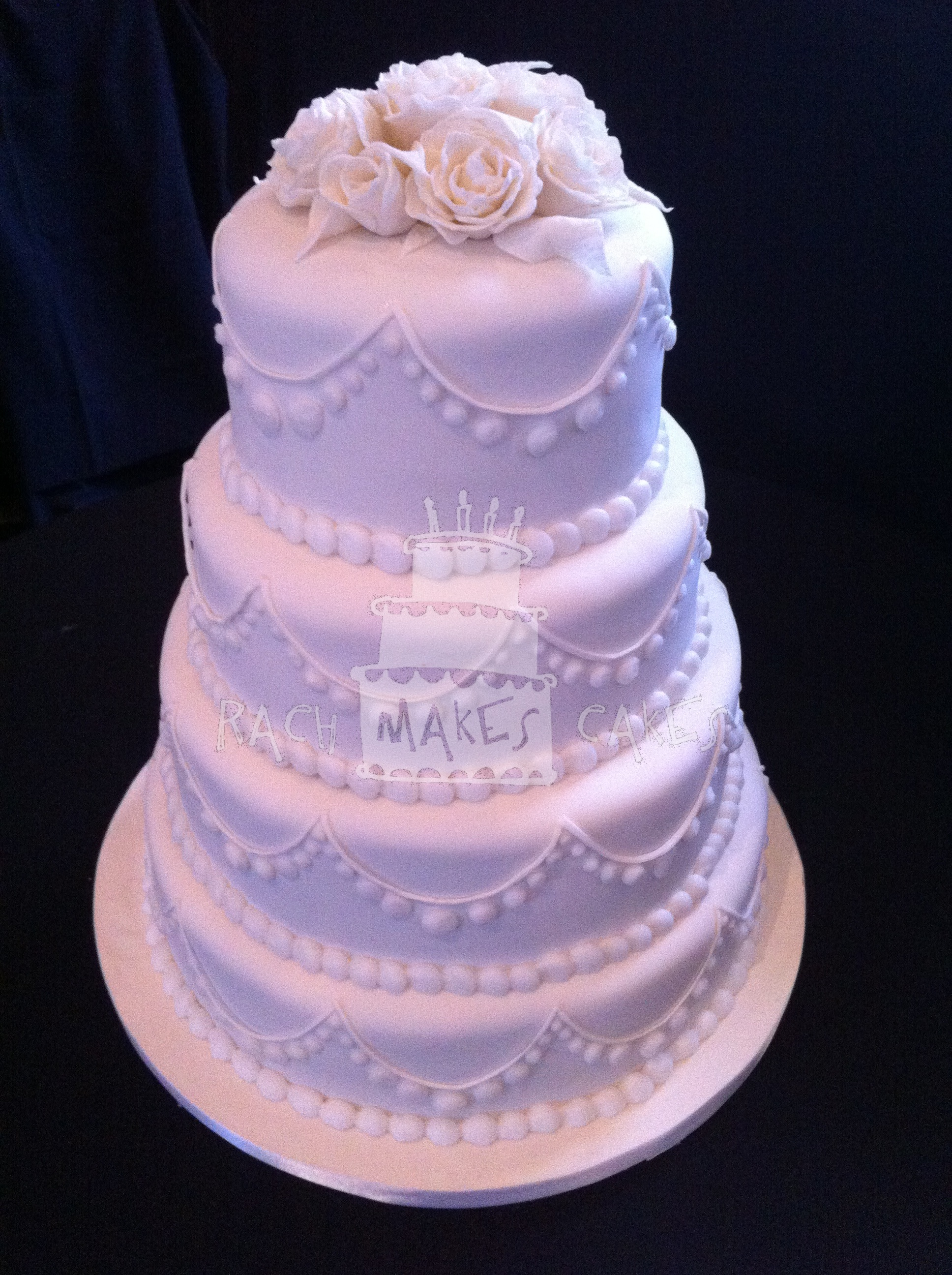 Each tier was covered in white fondant and I used white gumpaste to make the swags. I used tips 4, 5, 10, and 12 to make the dots and tip 12 for the border. White gumpaste roses made the perfect topper.