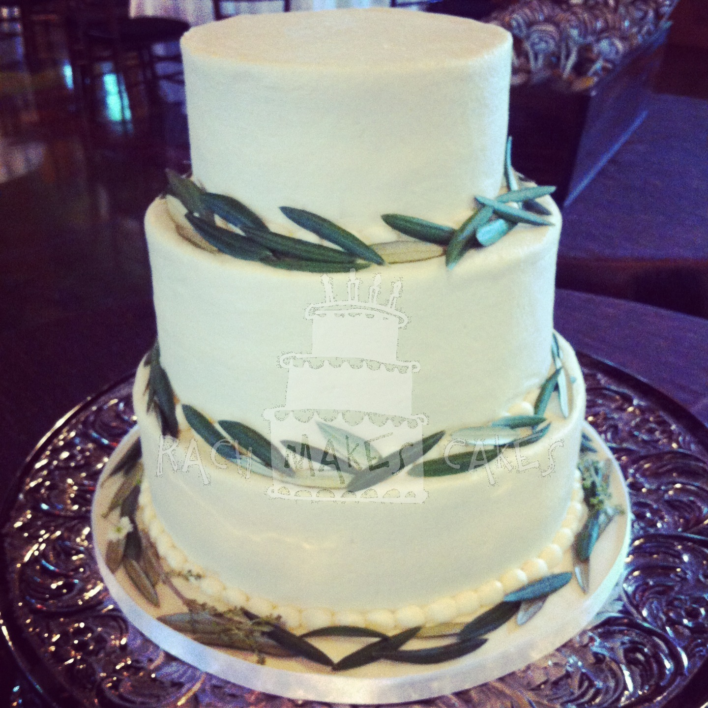I made this wedding cake for Angie and Jon. They chose to have a simple, natural wedding. The olive leaves were the perfect addition to the cake.