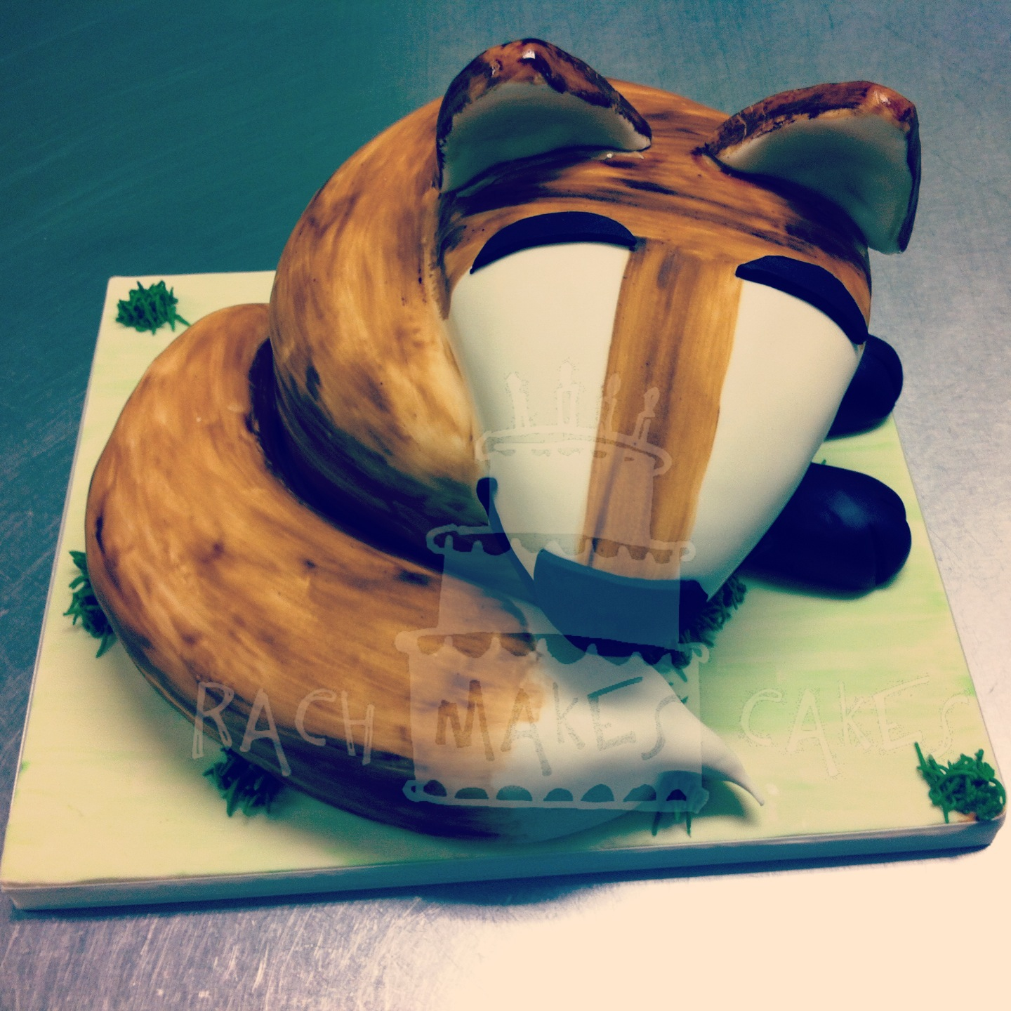 The head and tail are both made of rice cereal treats and then I covered the whole fox in fondant. The fox’s eyes, nose and mouth were made from black fondant and I painted him with Wilton’s Brown icing color.