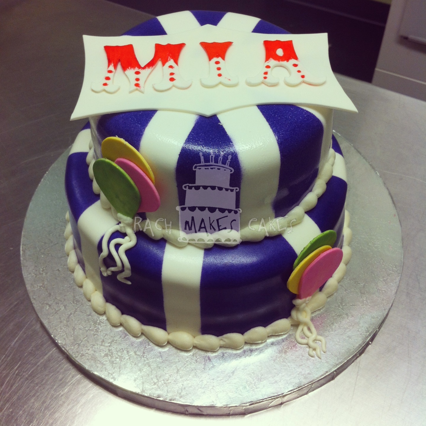 September 12, 2013 By rachmakescakes Carnival Cake This cake was inspired by the party invitation, which included purple stripes, balloons and circus-like lettering. Tweet Pin It