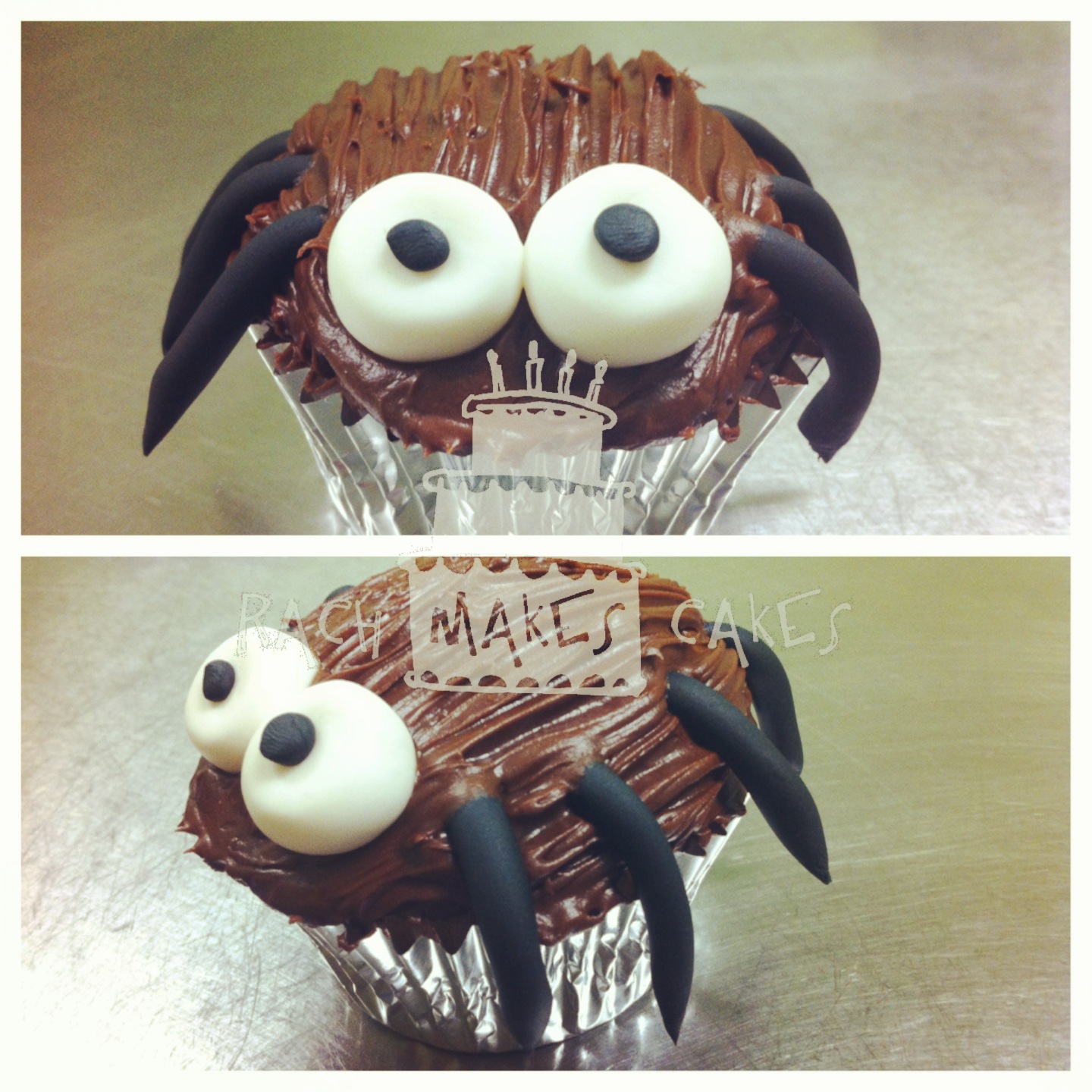 When cupcakes have cooled completely, ice them with chocolate fudge icing. Add eyes and legs.
