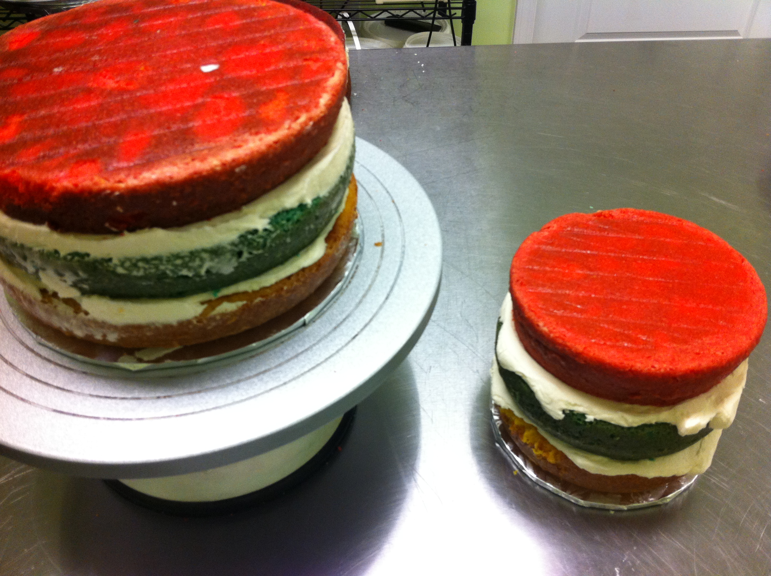 Even the layers of vanilla cake were colored to match the party. Here’s what it looked like before I iced it.