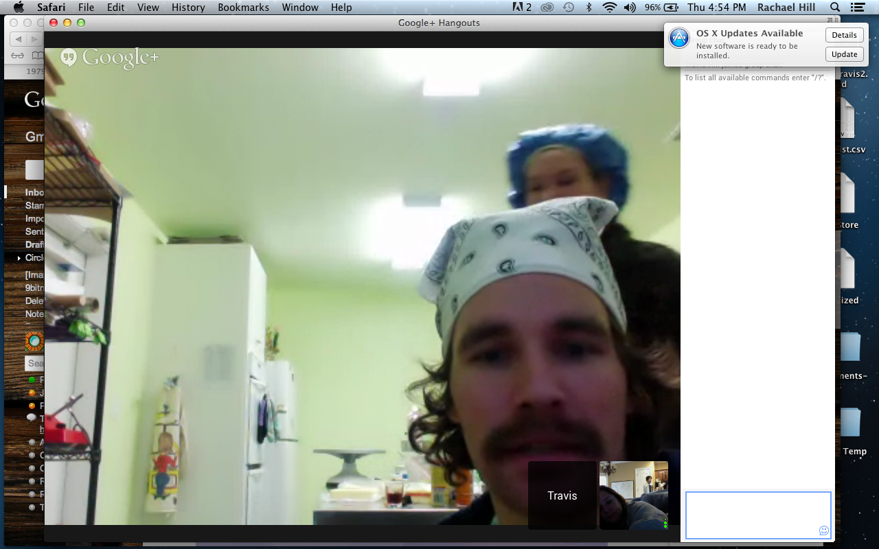 Trav’s mom even offered to come help for a while. I coached him through mixing the batter and while the cakes were in the oven, they made the icing. Here’s a screen shot of them talking to me. You can see me laying on the couch in the small box on the right.