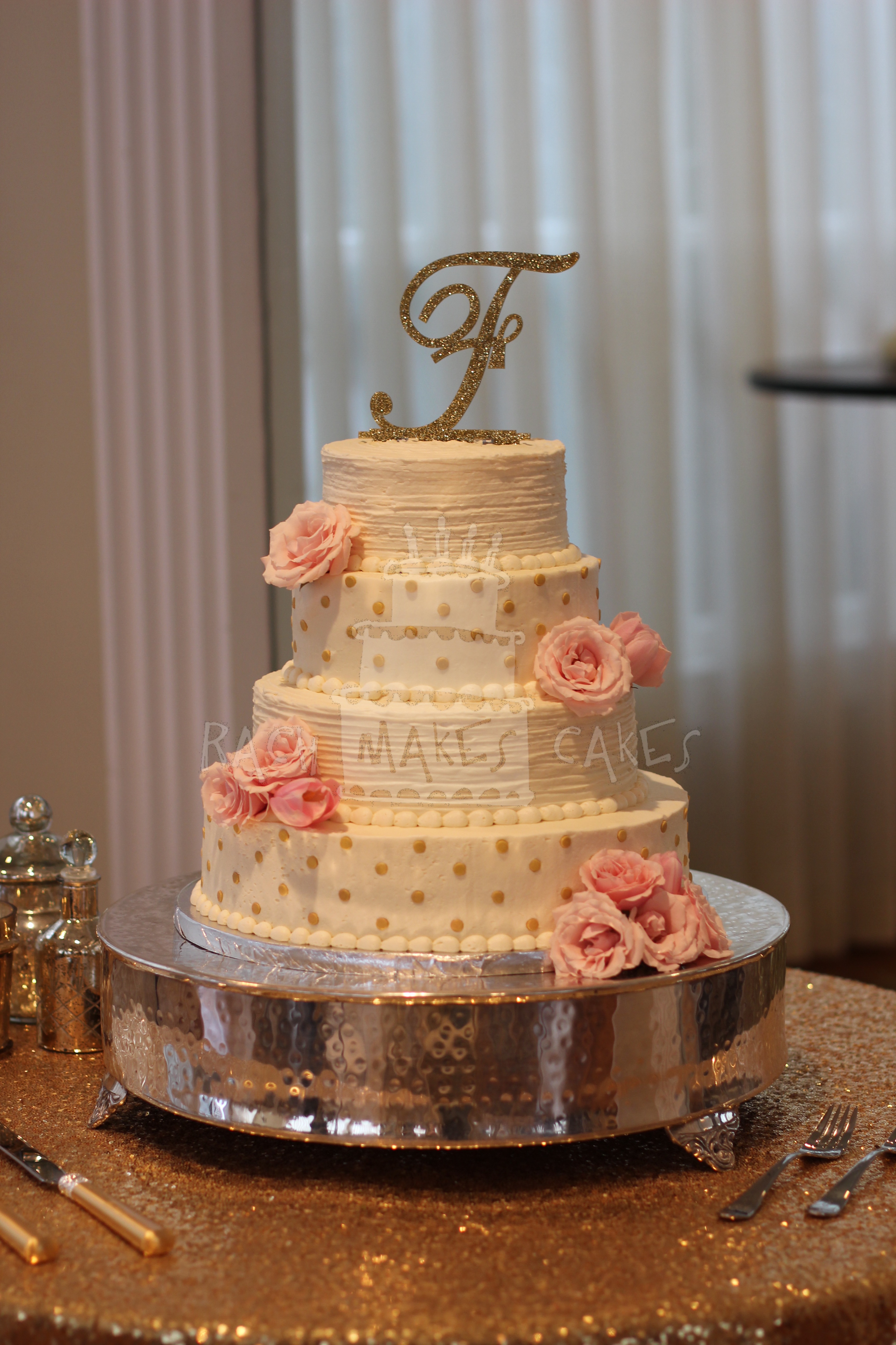 October 26, 2015 By rachmakescakes Buttercream Wedding Cake with Fresh Flowers Katherine and Brett designed an all-buttercream wedding cake adorned with gold dots and fresh flowers. I just love how it turned out! (Fresh flowers from Boukates) Tweet Pin It