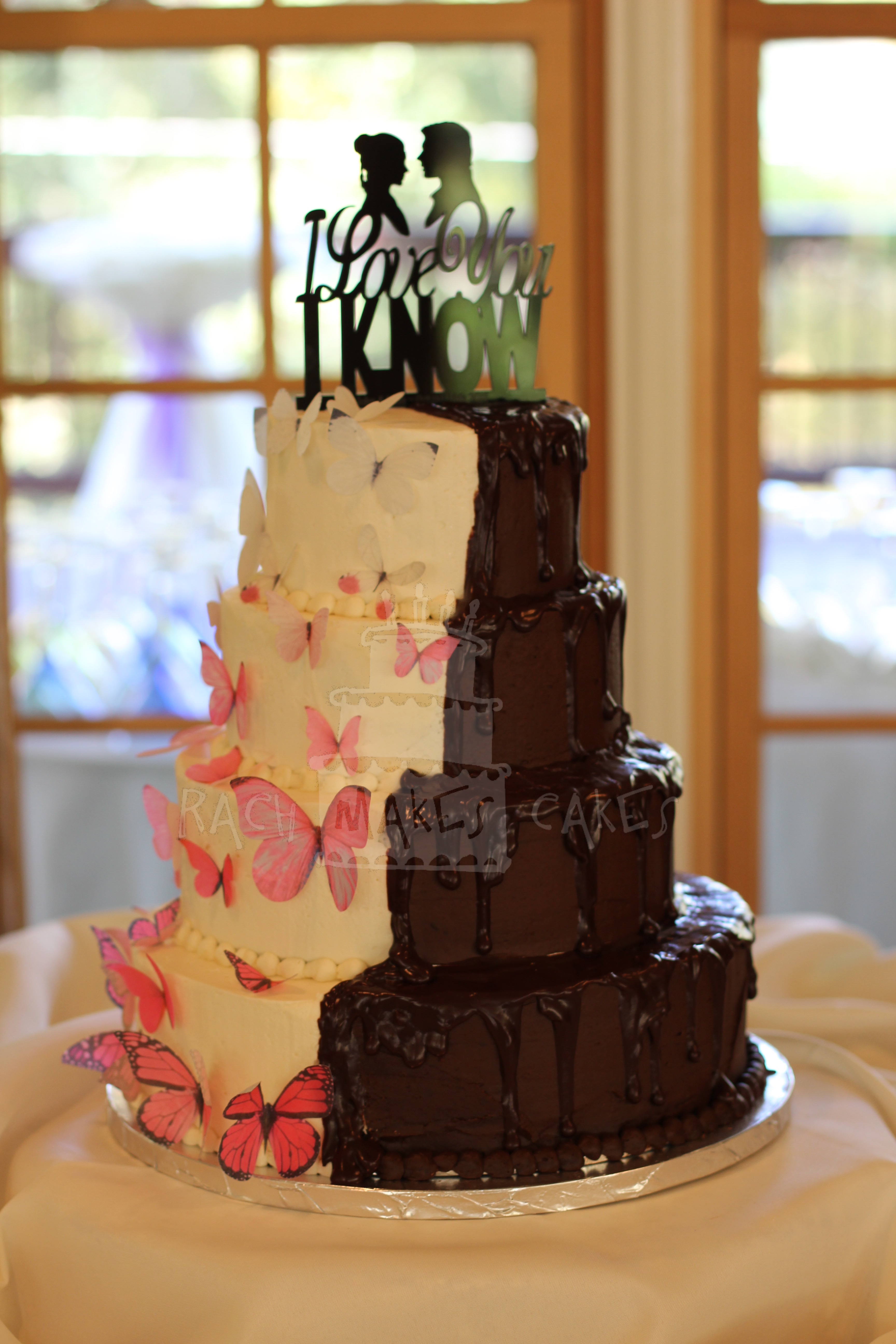 October 28, 2015 By rachmakescakes Wedding/Grooms Cake Nina and John wanted a unique wedding cake. He loves Star Wars, she loves butterflies, and the wedding cake intertwined both of their interests. (Wafer paper butterflies from incrEDIBLEtoppers) Tweet Pin It