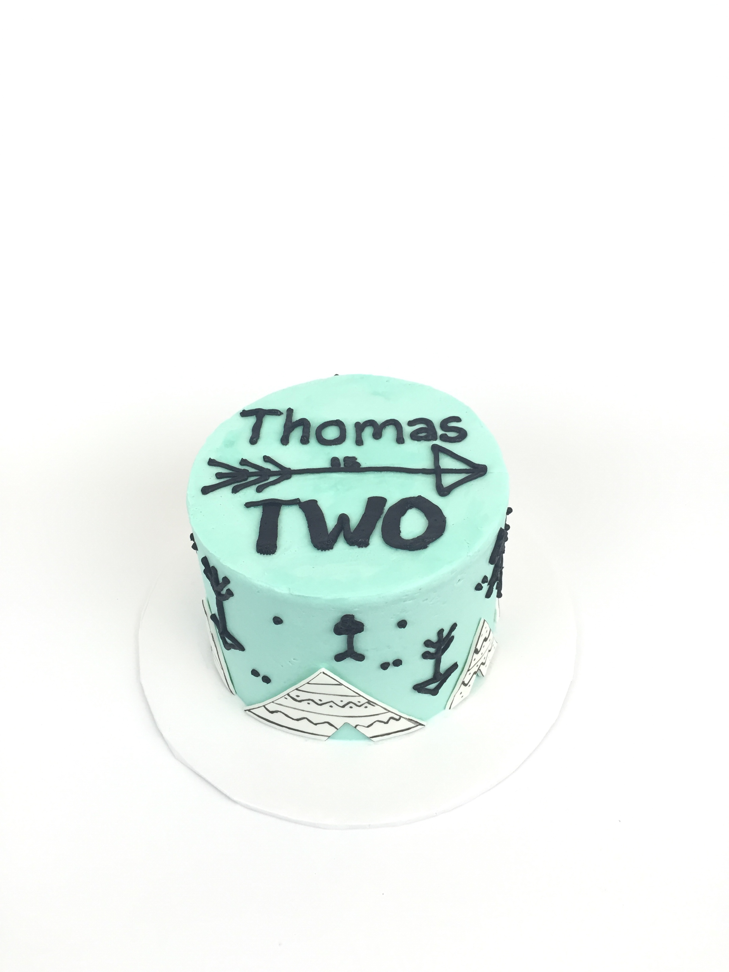 I made my buttercream that same blue-green color as his pants, added some teepees, arrows, and a similar font. I love how it turned out: