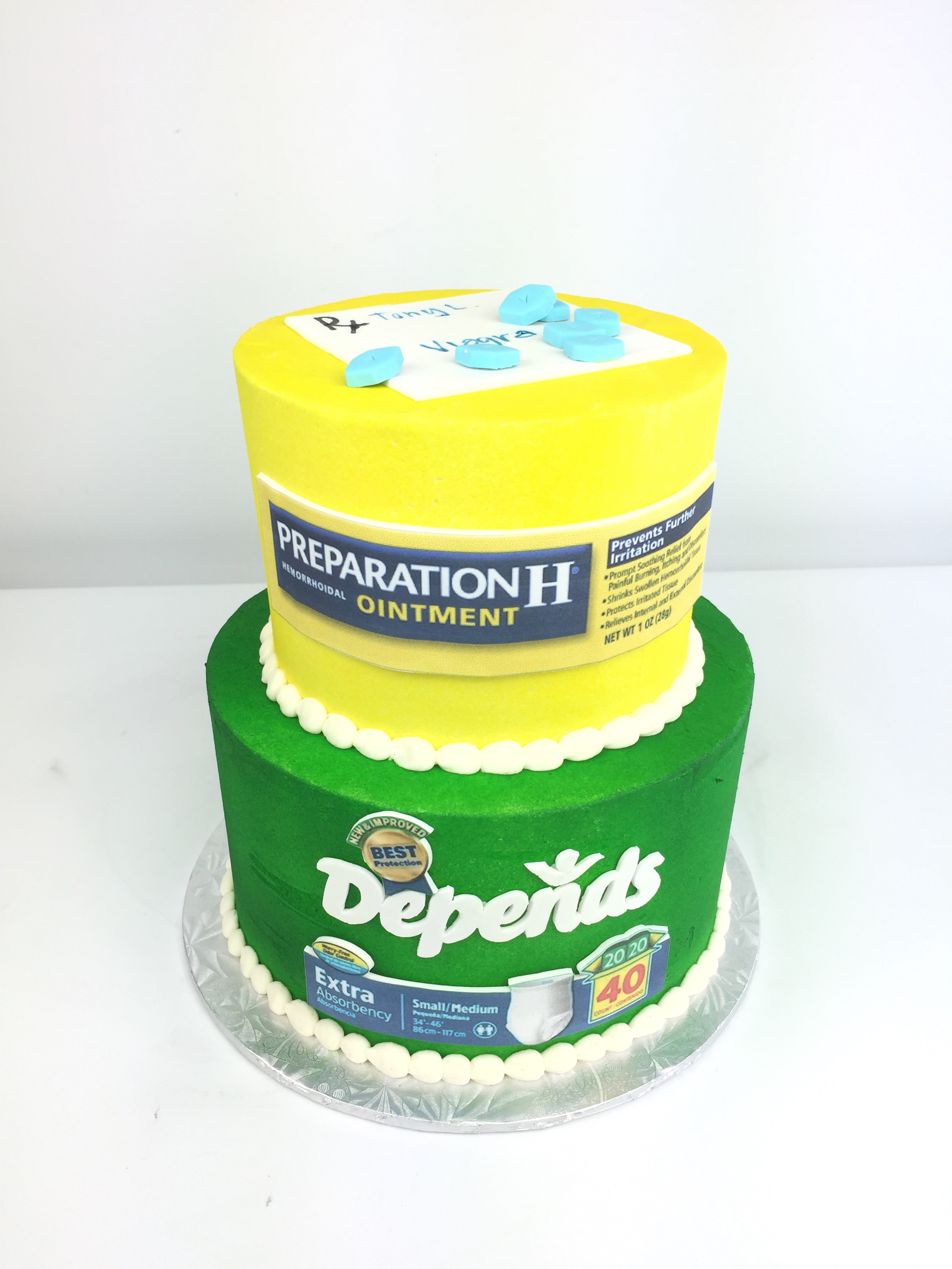 October 18, 2017 By rachmakescakes 40th Birthday Cake When your friend turns 40, you need a cake with all of the “old people” stuff on it…Viagra, Preparation H, and Depends! Tweet Pin It