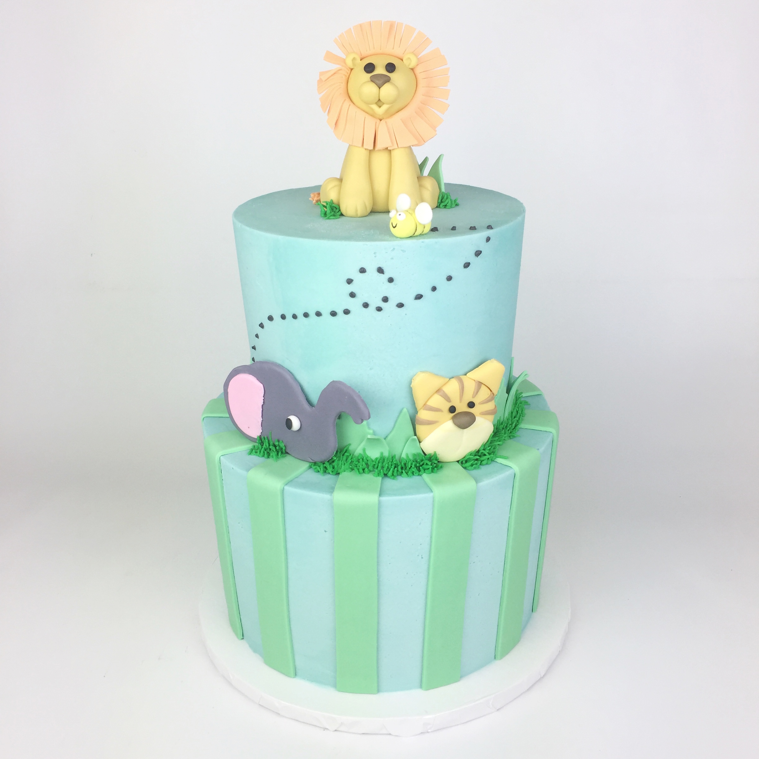 All of the accents were made from fondant, even the 3-D lion on top. I used a milkshake straw as my central support and built everything else around that. To get the rounded edges on the 2-D animals I placed plastic wrap over my fondant and then cut the shapes out. Bonus: those cutters don’t get dirty!