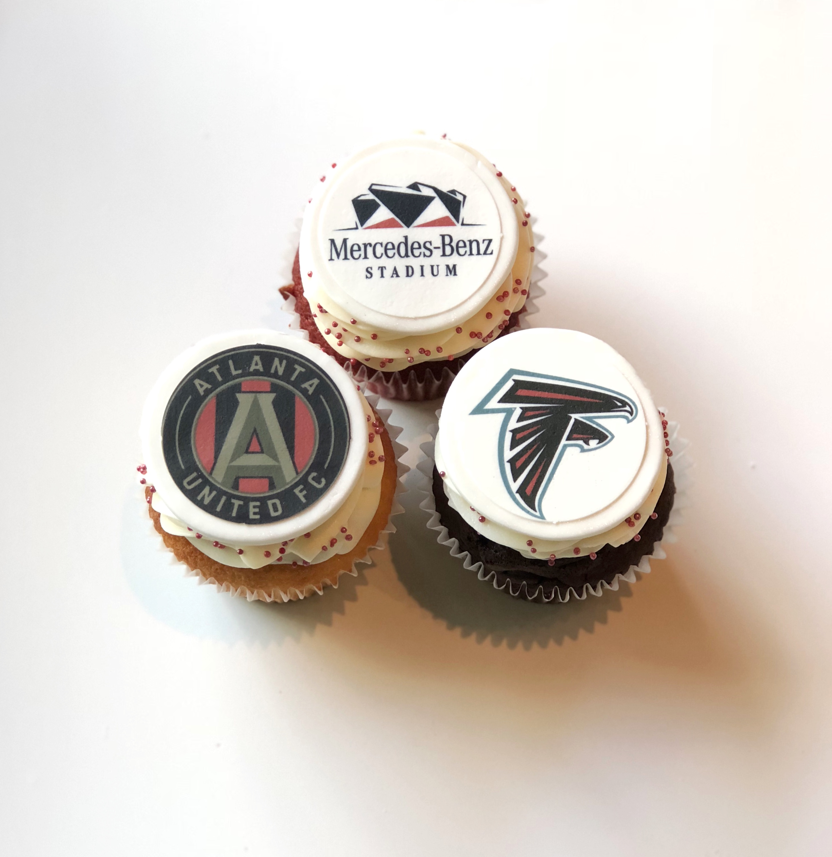 The folks over at Mercedes-Benz Stadium had a kick-off party prior to the first Falcons game of the season. They celebrated with vanilla, chocolate, and red velvet cupcakes topped with logos for the stadium, Falcons, and Atlanta United!