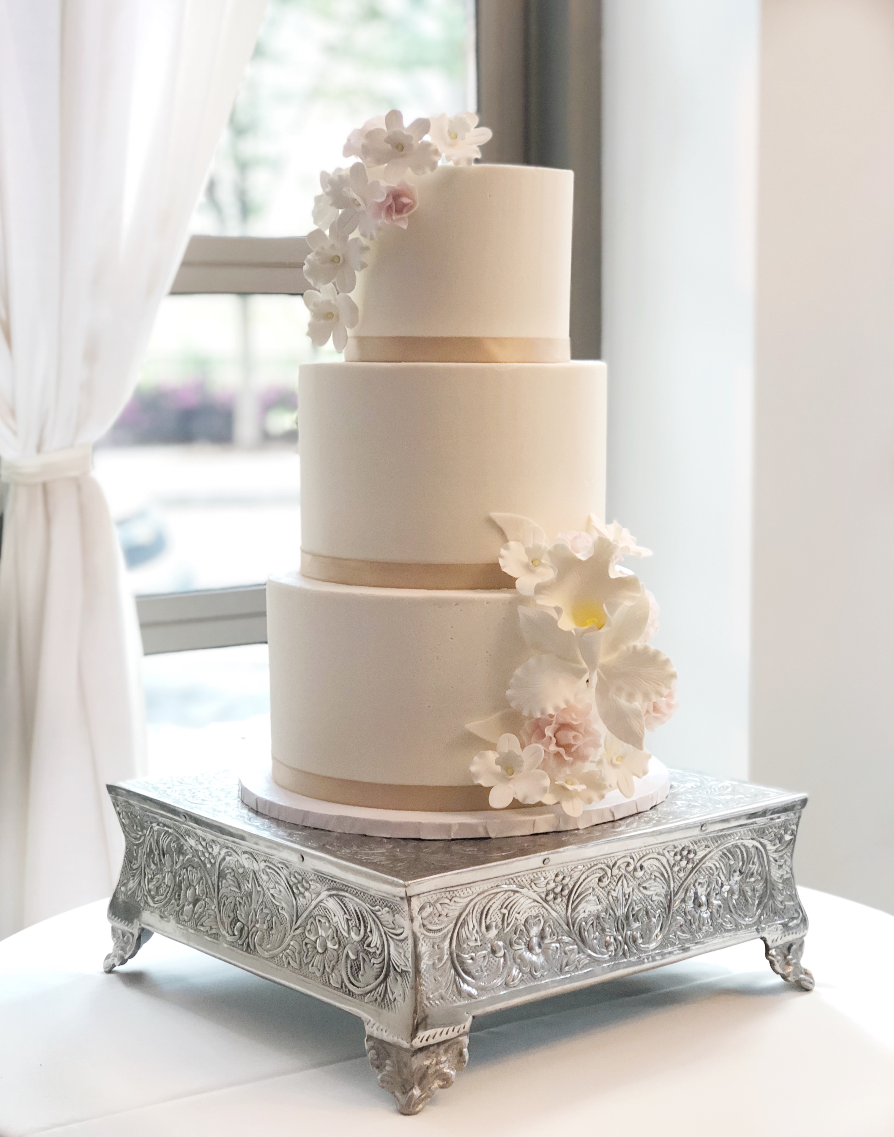 January 13, 2019 By rachmakescakes Congratulations to Kaya & Michael! The classic, clean lines of this wedding cake are perfectly complimented with gumpaste roses and orchids. Tweet Pin It